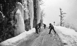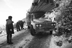 一九九七年十一月二十四日,連續(xù)多日大雪,把整個二郎山裹得嚴嚴實實,白茫茫一片。陣陣山風吹過,大霧就像瀑布一樣,從山頂直往下翻涌傾瀉。 一大早,州交通局打冰除雪排險的干部職工就從二郎山管理站直奔山埡口。載有防滑砂的大貨車穿迷霧,繞山梁,向山頂埡口疾馳。由于氣溫太低,霧又大,車上的擋風玻璃很快就結下了冰,路面打滑非常嚴重。前面車輛堵了起來,排險人員只好下車步行。 大霧彌漫,能見度很底,陰霾的天空又飄起了紛紛揚揚的雪花,剌骨的寒風陣陣襲來,只聽見車蓬布在風中“嗶剝”作響,卻看不見前面到底堵了多少車。排險人員只好相互攙扶踩著冰滑的邊路艱難地向行。好不容易來到堵在最前面的車子面前。原來是一輛載著原木的東風牌大貨車側滑在公路上,把整個公路堵死了。 局領導當即指揮大家用鋼釬、鐵鎬和鋤頭處理冰道,沒有撮箕,大家借來加水桶裝運冰雪……氣溫仍在急劇下降,剛從雪堆里刨出來的路,又被結起一層冰,就像地面上澆上了油,這就是冰雪道上有名的“桐油凌”。 有二位老同志不顧年老體弱,積極參與打冰除雪,一個在打冰時,被彈起的冰碴把腦門劃了一個口子,鮮血直往外冒。有人想幫他包扎,他堅決不干,自己就用手帕按住,把帽子向下拉蓋住傷口就算了。血從手帕中浸透出來,與眉毛上的冰凌結在一起。氣溫太低,冰層太厚,十字鎬每挖一下,多數情況下也就是挖下一個白點而已。不一會兒,另一位老同志已是滿頭大汗,大家勸他休息一下,他卻說:趁著現在雪不是太大,早點把主道上的冰雪多除點,過往二郎山的車輛就多一份安全。 排險人員的手凍紅了,刨冰雪碰傷的指頭還流著鮮血,身上蒸發(fā)的熱氣,把衣領口、袖子口和褲子口結成了冰,可是,誰也沒有吭一聲。 ……受堵車輛終于向前開動了。 風,越刮越猛,雪,越來越大。 防滑車在冰雪道上艱難地向前爬行著,車箱上面的職工們揮舞的洋鏟向路面撒著防滑砂。一路上風絞雪,防滑車象一頭不聽使喚的牛,顛簸、亂竄,好不容易才來到260(二郎山最險處),對這里“桐油凌”路面進行重點防滑處理后,防滑車又返回來,開始向山頂進發(fā)……風雪二郎山上打冰除雪、防滑排險,看似沒有驚天動地的壯舉,身臨其景才知其艱難辛苦。難怪當年每每經過二郎山冰天雪地奇險路段的車,都會向風雪中屹立路邊的交通系統(tǒng)排險保暢通的職工們鳴笛致敬,風雪中的那份情彌足珍貴。 川藏線上的老司機傳下來一首傷心的順口溜:“車過二郎山,如闖鬼門關,萬幸不翻車,也要凍三天!”其險峻實為罕見,尤其是途經二郎山260(公路公樁)處,曾被淡虎色變的人稱為“鬼招手”的險路段。 1983年1月3日,有著安全行車44萬公里記錄的一位駕駛員開著輛嶄新的東風牌貨車,同行還有兩名職工,夜行二郎山,在彌天大霧中神秘地“失蹤”了。十五天后,搜山的人才用望遠鏡看到260公里路樁處的山崖下,有一塊汽車破篷布掛在樹枝,猶如招魂的凄厲幌幡在冷風中招搖晃動。鋼纜繩吊著搜山的人下到崖下400米深處的谷底。扒開一座座雪堆,叫人汗毛倒豎:雪堆下,盡是廢大梁、爛車廂、銹車頭和支離破碎的汽車,足有一個汽車連!一輛不知埋了多久的卡車廂里牛肉已腐爛,駕駛室里坐著三具發(fā)黑的僵尸……其狀慘不忍睹!