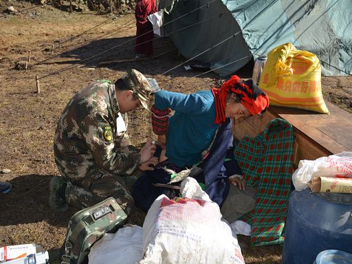 地震發(fā)生僅1小時(shí),總隊(duì)政委金德成即帶前指,從雅江翻越海拔4400余米的高爾寺山向塔公方向開進(jìn)。與此同時(shí),應(yīng)急救援分隊(duì)分別從康定星夜兼程,疾速奔赴重災(zāi)區(qū)。21時(shí)03分,前指抵達(dá)震中塔公鎮(zhèn)奪讓一村和受災(zāi)嚴(yán)重的木雅祖慶小學(xué),深入村寨了解受災(zāi)情況,派出38名應(yīng)急救援官兵,對房屋受損嚴(yán)重的7戶災(zāi)民先期展開救援,搶挖出被倒塌墻體壓埋的車輛2臺(tái)。并及時(shí)來到康定地震前線指揮部,請領(lǐng)任務(wù)。連夜為木雅祖慶小學(xué)師生搬運(yùn)棉被、搭建帳篷,幫助受災(zāi)師生順利度過震后第一個(gè)夜晚。