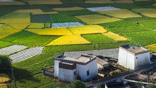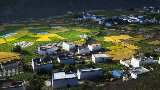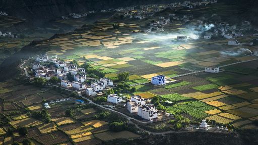 清晨,瓦藍(lán)瓦藍(lán)的天空云霧繚繞,周圍的景物一片朦朧,就好像童話里的仙境,一會兒,太陽從東邊冉冉升起,霧也漸漸消失,村子里屋頂上飄著裊裊煨桑的煙子,我站在山岡上從高處向下俯望,只見高山峽谷之中,層層翠綠的梯田簇?fù)碇l(xiāng)城特有的白藏房,山下的田野,就像一片金色的海洋,將秀麗的田園裝扮得更加如詩如畫。一陣晨風(fēng)吹過,麥田上蕩起了一道道金色的波紋,遠(yuǎn)處傳來了畫眉鳥的歌聲,我被眼前的一切迷住了,仿佛一切都靜止了,她讓我的夢從這里開始。