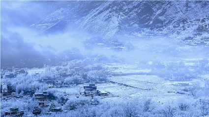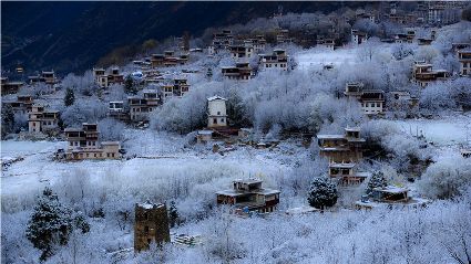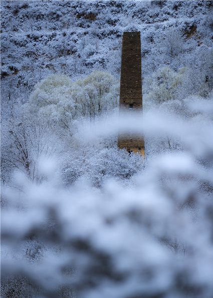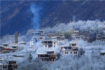 我以這份孤獨和執(zhí)著,爬上了東邊的山坡。雪停了,微風(fēng)習(xí)習(xí)。櫻桃花、桃花在雪枝頭冷艷,淡淡的幽香徐徐浸入心扉。滿眼望去,一片晶瑩,一片潔白。古碉藏寨在這片世界里,寧靜安詳,不容一絲一毫的驚擾。我懷疑自己進(jìn)入了那種叫做空靈的境界。