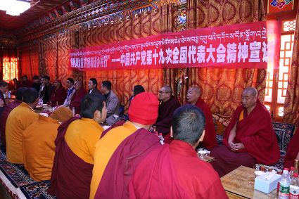 宣講團(tuán)成員勇勇用藏語激情洋溢的宣講黨的十九大精神,現(xiàn)場不斷響起熱烈的掌聲。當(dāng)勇勇講到我國五年來取得的輝煌成就時(shí),僧人們都激動(dòng)不已,紛紛為發(fā)展成就點(diǎn)贊。“聽了今天的宣講,我進(jìn)一步了解到了我們國家這些年來取得的發(fā)展成就。一直以來,黨對我們的關(guān)懷是看得見摸得著的,現(xiàn)在我們的寺廟管理越來越規(guī)范,基礎(chǔ)設(shè)施也得到了完善,通往寺廟的道路也有了明顯改善,我們的生活越來越好了,這一切都是共產(chǎn)黨的功勞?!彼聫R僧人尺乃表達(dá)著對黨的感恩。