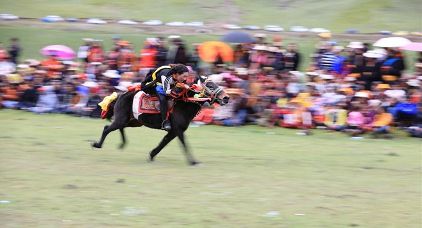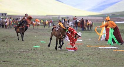 7月23日,四川甘孜藏族自治州理塘縣村戈鄉(xiāng)賽馬活動(dòng)開(kāi)始,牧民們?cè)隈R背上一顯身手。每年藏歷六月,當(dāng)草原上格桑花盛開(kāi)的時(shí)候,四川省理塘縣24個(gè)鄉(xiāng)(鎮(zhèn))就會(huì)按照習(xí)俗舉辦隆重的賽馬會(huì)來(lái)拜祭神山,慶祝豐收。迄今有400多年歷史的賽馬分為耐力賽、小走賽、馬術(shù)賽等,其中最為精彩的是馬術(shù)賽:馬肚藏身、馬背倒立、飛騎射擊、拾哈達(dá)等,驚險(xiǎn)刺激。2008年6月,此項(xiàng)活動(dòng)被列入四川省級(jí)非物質(zhì)文化遺產(chǎn)保護(hù)項(xiàng)目。(朱虹 葉強(qiáng)平)