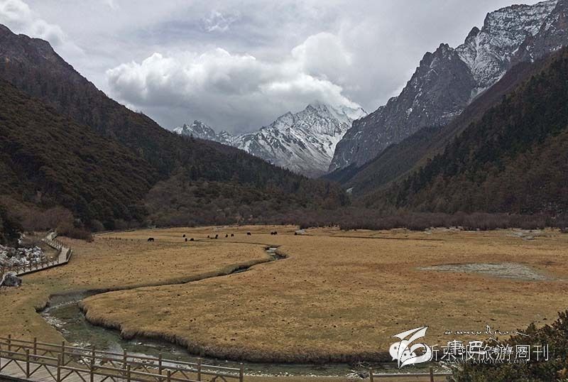 大概20分鐘左右的車程,我們到了洛絨牛場。這是一個(gè)被雪山環(huán)繞的草甸,仙乃日、央邁勇和夏郎多吉三座6000米的雪峰呈“品”字形分別位于西北、東南和東面,雪峰之間,形成了一片長寬約5公里的高原寬谷。
