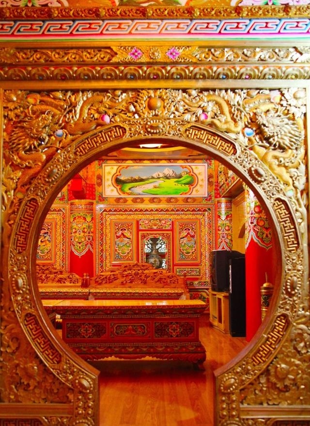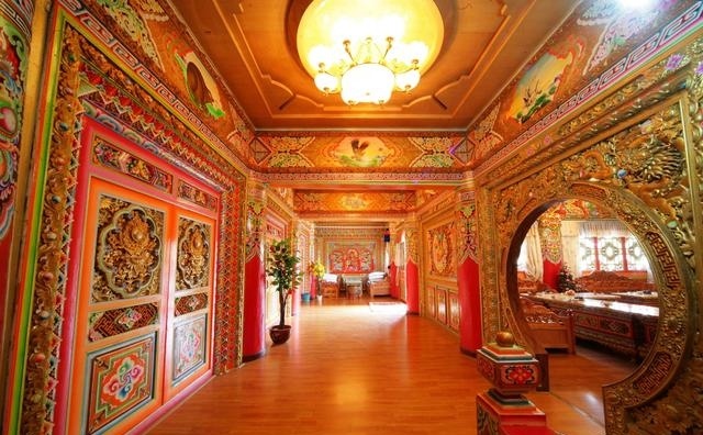 道孚民居室內(nèi)精雕細(xì)鏤,描金繪彩,每一個(gè)圖案或圖畫就是一個(gè)吉祥物或一個(gè)傳說(shuō)。民居客廳陳設(shè)豪華,富麗堂皇,極顯主人的富有;經(jīng)堂供奉佛像,酥油燈長(zhǎng)明,是家中的清靜之地;臥室多用箱式或椅式藏床,陳設(shè)溫馨而別具風(fēng)情。