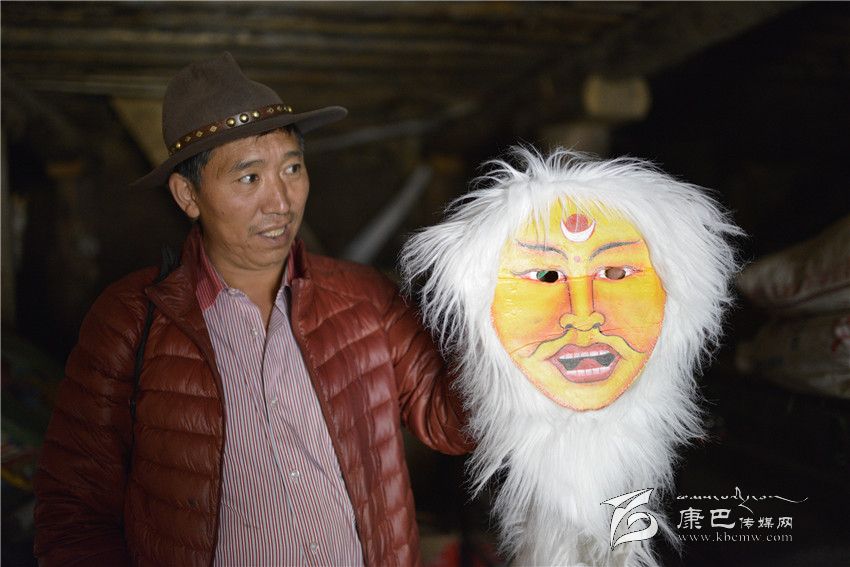 午飯后,洛絨丹巴帶我到離家不遠的一個小院,推開底樓嘎吱作響的木門,借助外面的光亮,看見有幾個巨大的鐵皮箱。洛絨丹巴打開一口箱子,不想里面整齊地放著各種戲服;第二口箱子是頭飾,唐朝文成公主的、清朝皇帝的。這些服裝和頭飾多是模仿電視電影,或者加上想象自己制作的,個別是外地方買回的。最具特色是第三口箱子,用牛皮制作的各種面具、表情十分夸張,有和善的、猙獰的、威風的,神情各異。面具的顏色各種各樣,白色、黑色、黃色、紅色等。眼睛和嘴巴處挖了窟窿,有的還在面具外圍綴了一圈羊毛。洛絨丹巴指點著各種顏色的面具介紹:白色代表純潔、紅色代表威嚴、黃色代表吉祥;巫女則半黑半白,象征其兩面三刀的性格;青面獠牙代表妖魔。說起這些他如數(shù)家珍。