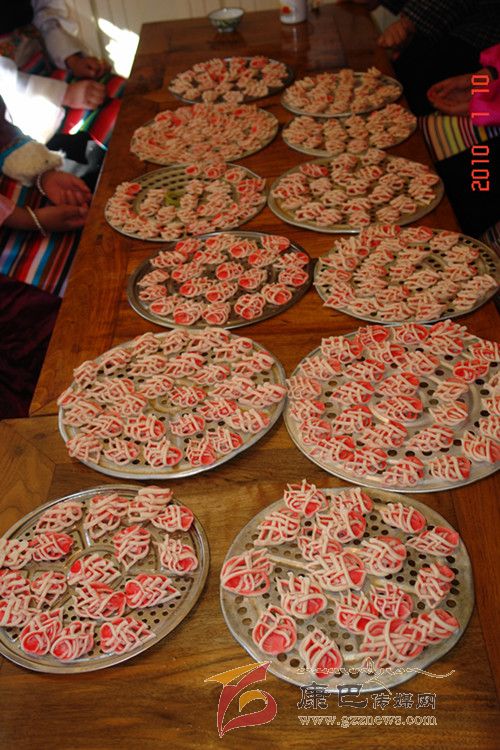 “花茹”是一種用面粉制作的糕點(diǎn),是巴塘人逢年過節(jié)、婚禮慶典等節(jié)慶日不可或缺的美食佳肴,可以這樣說,在節(jié)日期間或宴請(qǐng)賓朋之日,在眾多的糖果糕點(diǎn)中,如缺少了“花茹”,便自然就失去了巴塘風(fēng)味。