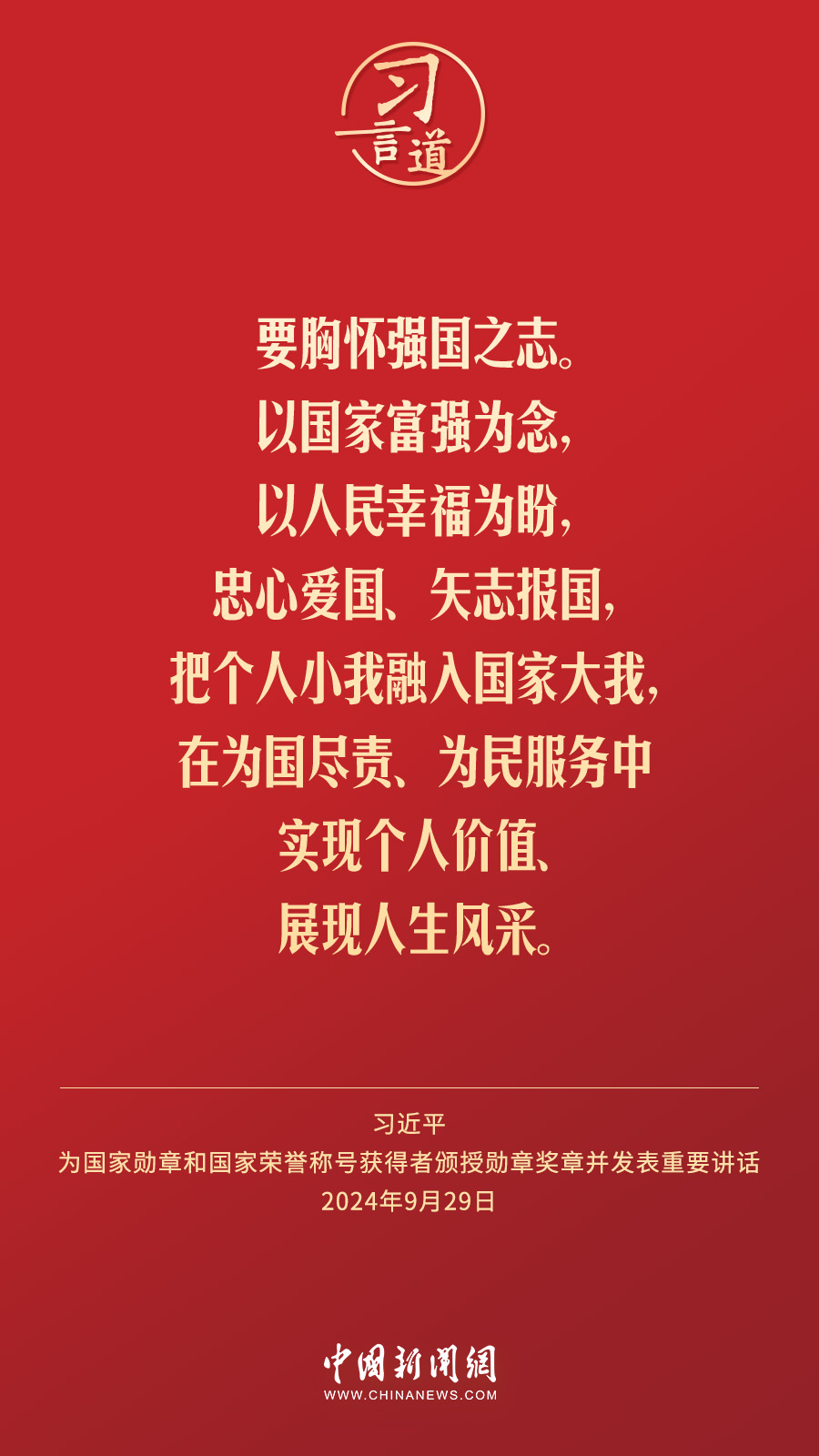經(jīng)中共中央批準(zhǔn),中華人民共和國國家勛章和國家榮譽(yù)稱號頒授儀式于9月29日上午10時(shí)在人民大會堂隆重舉行。中共中央總書記、國家主席、中央軍委主席習(xí)近平向國家勛章和國家榮譽(yù)稱號獲得者分別授予“共和國勛章”“友誼勛章”和國家榮譽(yù)稱號獎?wù)虏l(fā)表重要講話。習(xí)近平指出——