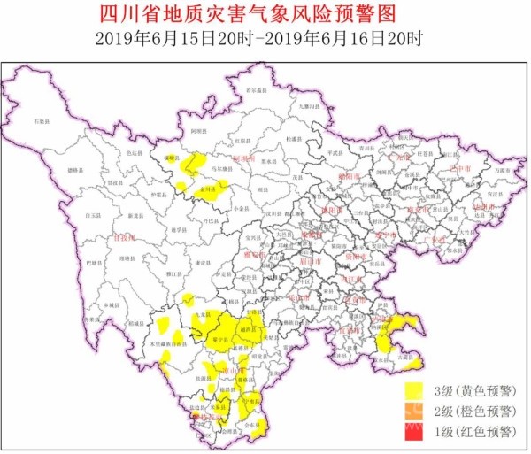 四川在線消息(記者 寇敏芳)6月15日,省自然資源廳發(fā)布全省地災(zāi)氣象風(fēng)險(xiǎn)預(yù)警。結(jié)合四川省氣象臺天氣預(yù)報(bào)情況,6月15日20時(shí)~6月16日20時(shí),全省地質(zhì)災(zāi)害氣象風(fēng)險(xiǎn)預(yù)警等級為3級(黃色預(yù)警,注意級),具體結(jié)果如下: