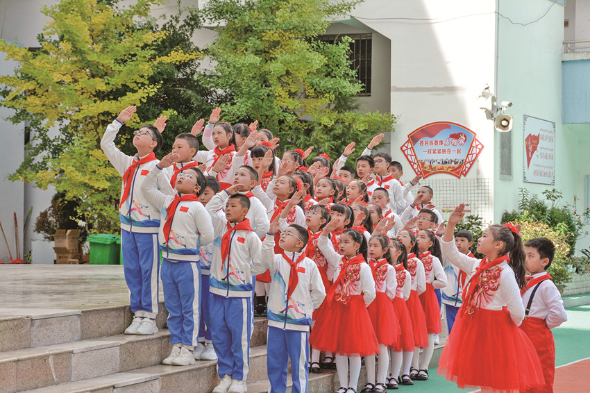 活躍提升組織生活也是少先隊工作強(qiáng)基固本的重要環(huán)節(jié)。通過健全少先隊階梯式成長激勵體系;全面實施分批入隊、分段教育、分級激勵和推優(yōu)入團(tuán);依托“紅領(lǐng)巾獎?wù)隆备采w隊中教育全過程等措施,全市14至15周歲新入團(tuán)團(tuán)員經(jīng)由少先隊組織推優(yōu)入團(tuán)達(dá)100%。此外,全覆蓋開展“開學(xué)第一堂隊課”、主題隊課活動,規(guī)范舉行入隊儀式等,讓少先隊員組織意識和光榮感全面增強(qiáng)。
