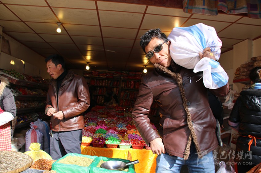 走進郭達橋重康糖果店,洛讓說:“多買點糖果糕點,娃娃老婆喜歡。”然后照單點貨:花生10斤、瓜子5斤、葡萄干5斤、水果糖5斤、軟糖5斤、炒米糖10斤……一下就指點了八九種糖果糕點??吹搅诉@樣的生意,老板樂開了花。與洛讓大包大攬的氣派不同,長期經(jīng)商的扎西老練地詢價:“老板,我們買這么多,要優(yōu)惠喲。”一番討價還價之后,洛讓和扎西買了十種糖果,用去1066元,裝滿整整兩編織袋。洛讓把糖果過扛在肩上,對筆者說:“你來試一下,有點分量,你別說,辦年貨也是一種體力活喲?!?/p>