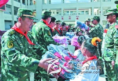 儀式上,8722部隊向?qū)W校贈送了價值萬余元的學習用品,拿著裝有鉛筆、水彩筆等各種文具的“愛心書包”,孩子們興奮不已。12歲的藏族女生登真啟珍告訴筆者:“今年的‘六一’兒童節(jié),武警部隊的叔叔們專門來看望我們,還送來了禮物,我感到特別開心。”儀式上,少先隊員們給參加慰問的部隊領(lǐng)導戴上鮮艷的紅領(lǐng)巾,孩子們還表演了精心排練的節(jié)目。一張張燦爛的笑臉,一陣陣蕩漾心扉的歌聲,傳遞著駐訓武警部隊與當?shù)厝罕姖鉂獾聂~水深情。