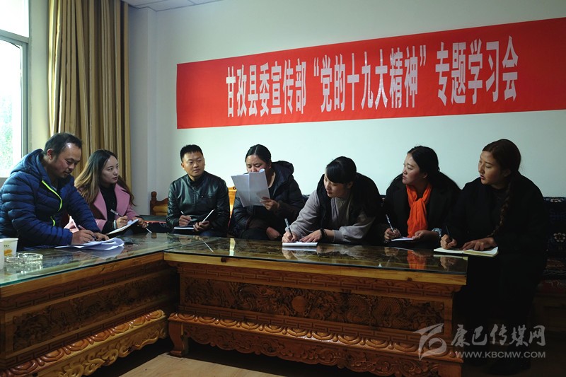 本網(wǎng)訊 (則瑪拉姆 文/圖)連日來(lái),甘孜縣依托中心組、干部講堂、“三級(jí)三講”等學(xué)教平臺(tái),圍繞“黨的十九大精神、《中國(guó)共產(chǎn)黨章程(修正案)》、習(xí)近平新時(shí)代中國(guó)特色社會(huì)主義思想、決勝全面建成小康社會(huì)”四大專(zhuān)題開(kāi)展學(xué)習(xí),采取專(zhuān)家輔導(dǎo)講、專(zhuān)題研討學(xué)、集中考學(xué)評(píng)等形式,迅速組織廣大黨員干部原原本本學(xué)、聯(lián)系實(shí)際學(xué)、突出重點(diǎn)學(xué),切實(shí)把黨的十九大精神轉(zhuǎn)化為謀劃發(fā)展的思路、促進(jìn)發(fā)展的舉措、領(lǐng)導(dǎo)發(fā)展的能力和推進(jìn)發(fā)展的合力。圖為11月6日下午,縣委宣傳部組織全體職工專(zhuān)題學(xué)習(xí)黨的十九大精神。